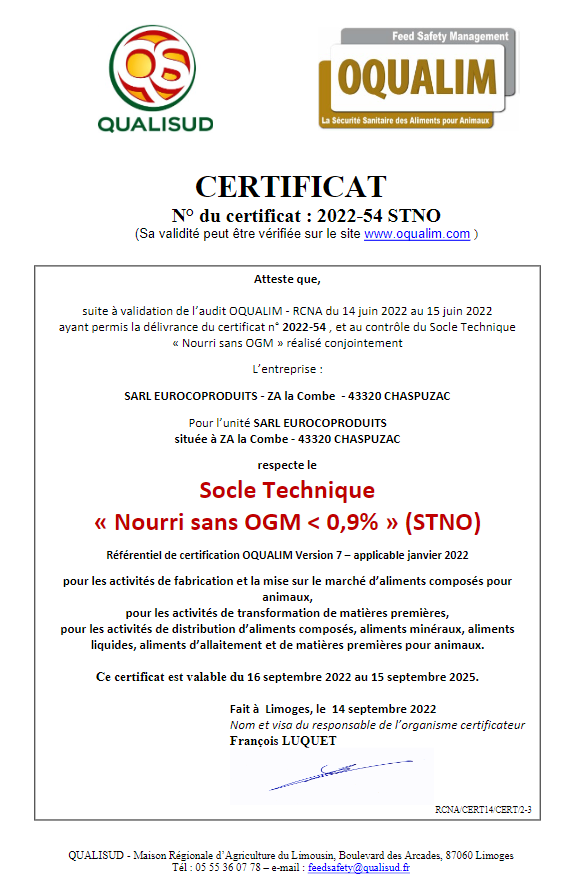 Force de notre large gamme de produits destinés à la consommation animale, nous garantissons une qualité optimale de nos produits. C’est pour cela que nous attestons être certifiés : BIO, RCNA/STNO, ainsi que BLEU-BLANC-CŒUR.